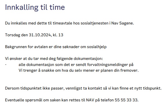 This message sent by NAV Sagene employee to the applicant on 24.10.24